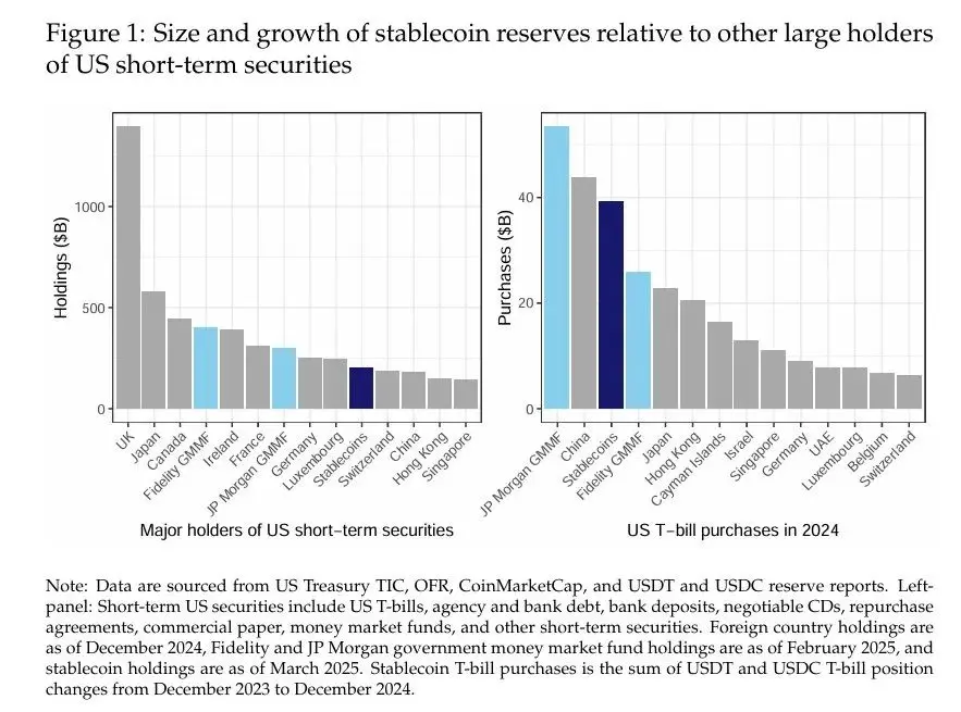 Dollar-backed stablecoins have experienced significant growth and are poised to reshape financial markets. As of March 2025, the total assets under management of these cryptocurrencies, which are pegged to the dollar at face value and backed by dollar-denominated assets, exceeded $200 billion, surpassing the short-term US securities held by major foreign investors such as China (Figure 1, left). Stablecoin issuers, particularly Tether (USDT) and Circle (USDC), primarily back their tokens with U.S. short-term Treasury bills (T-bills) and money market instruments, making them significant participants in the short-term debt market. In fact, in 2024, dollar-backed stablecoins purchased nearly $40 billion in U.S. short-term Treasury bills, a scale comparable to that of the largest U.S. government money market funds and exceeding the purchase volumes of most foreign investors (Figure 1, right panel). While previous research has primarily focused on the role of stablecoins in cryptocurrency volatility (Griffin and Shams, 2020), their impact on the commercial paper market (Barthelemy et al., 2023), or their systemic risks (Bullmann et al., 2019), their interactions with traditional safe-haven asset markets remain under-explored.