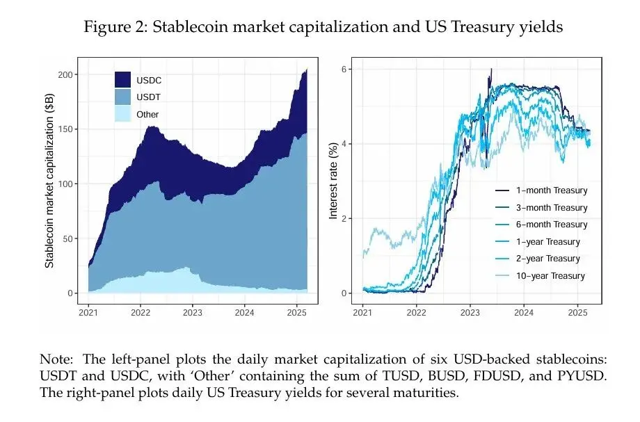 Figure 2 shows the market capitalization of USD-backed stablecoins and U.S. Treasury yields during the sample period. Stablecoin market capitalization has been rising since the second half of 2023, with significant growth at the beginning and end of 2024. The industry is highly concentrated. The two largest stablecoins (USDT and USDC) account for over 95% of the outstanding amount. The Treasury yields in our sample encompass both the rate-hiking cycle and the subsequent pause and easing cycle that began around mid-2024. The sample period also includes a distinct period of yield curve inversion, most notably the deep blue line moving from the bottom to the top of the yield curve.