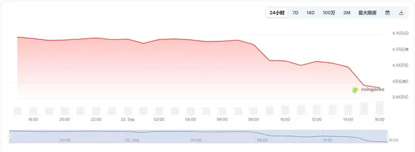 According to CoinGecko data, as of 18:00 on September 22, the global cryptocurrency market cap stood at $3.97 trillion, with a 24-hour change rate of -3.98%. This translates to a loss of nearly $160 billion in total market value.
